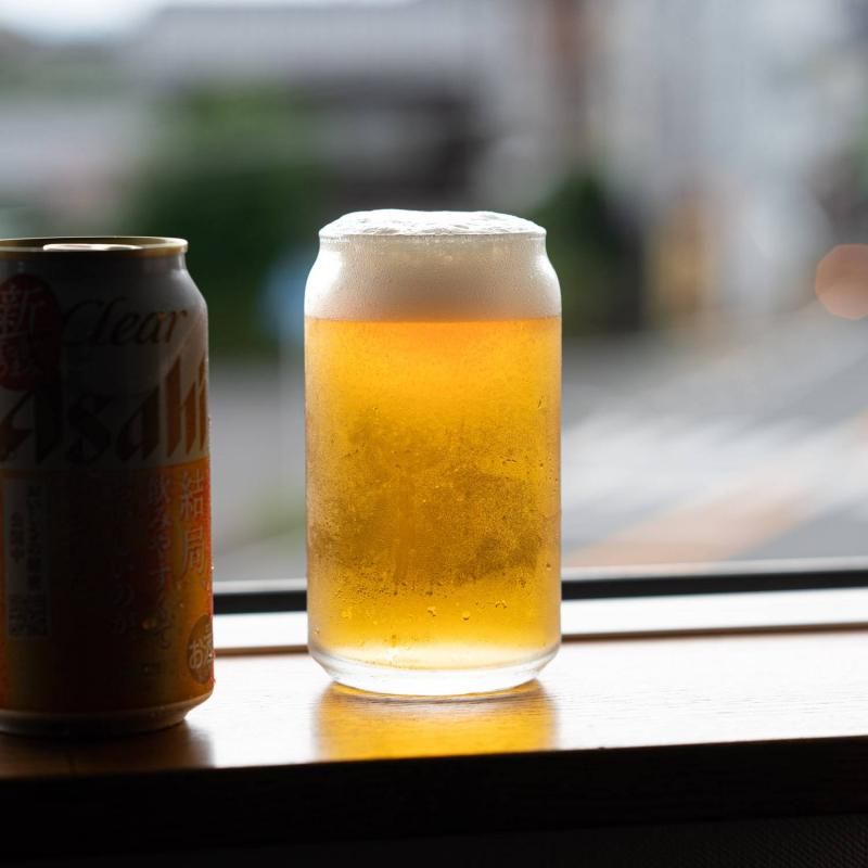 缶をイメージしたおもしろデザインガラスコップ。