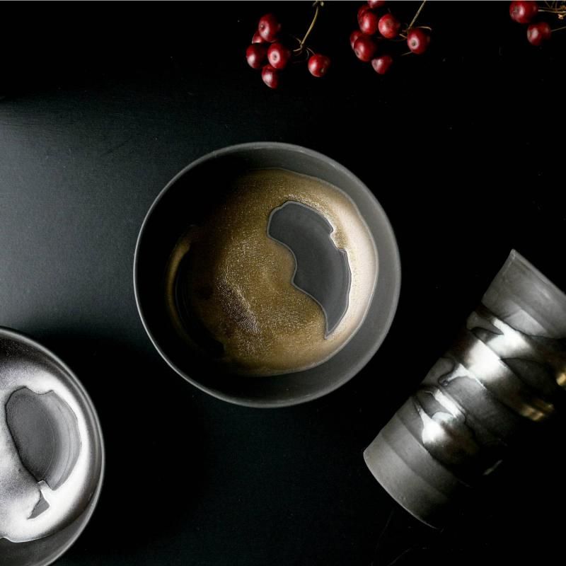 金と銀の釉薬は、すべて手酌掛けで行っています。きめ細やかな黒土を手仕事ならではの薄引きで作り上げます。